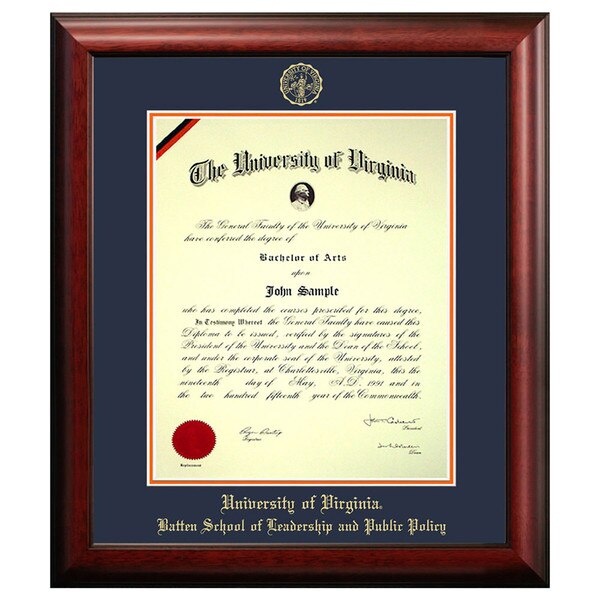 B5 - BATTEN SCHOOL OF LEADERSHIP & PUBLIC POLICY SATIN MAHOGANY DIPLOMA FRAME, NAVY & ORANGE MAT WITH GOLD UVA SEAL