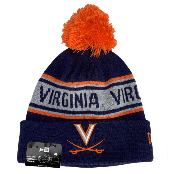 Virginia navy knit hat with orange pom. Sabre embroidered on cuff. Virginia written within orange and grey stripes.