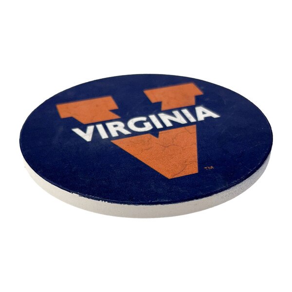 Show your UVA pride while protecting your furniture with this round coaster featuring a cork bottom. Its sleek design makes it a practical and spirited addition to any space.