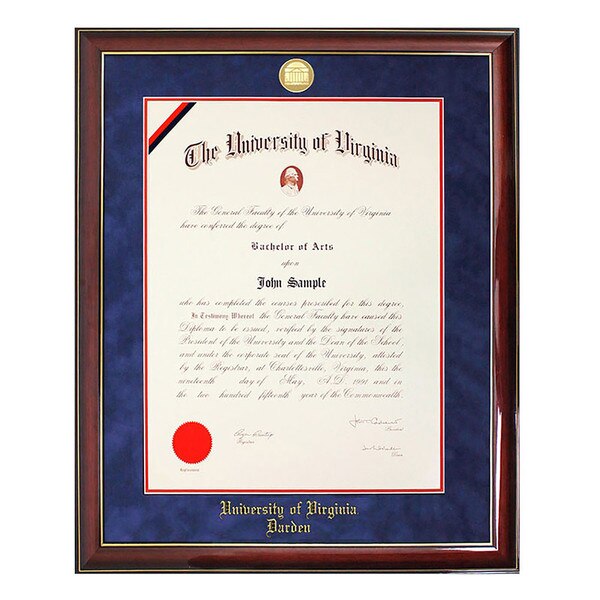 Check out this elegant gold edge mahogany diploma frame. This frame features archival quality navy suede and orange double mat with 24K gold-plated medallion. Only acid-free mounting materials are used for lifetime protection from discoloration and deterioration. Custom designed to fit the University of Virginia diploma.