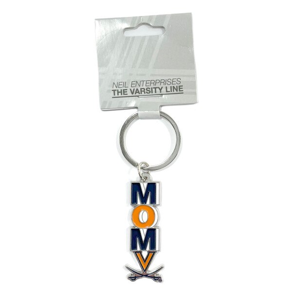 Elegant metal keyring featuring a tasteful design of 'Mom' and the UVA sabre logo, perfect for showing appreciation and school pride in a stylish accessory.