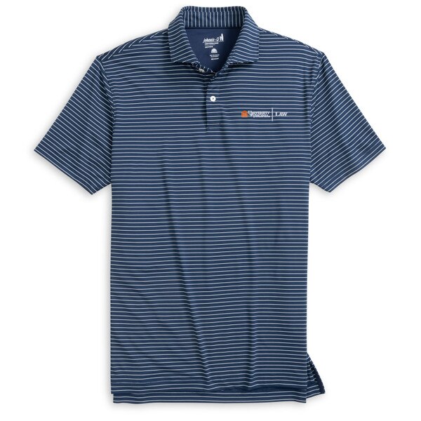 This men’s navy striped polo from johnnie-O combines classic style with UVA Law School pride, featuring a subtly embroidered logo. Made with performance stretch fabric, it offers comfort, polish, and ease from classroom to weekend.