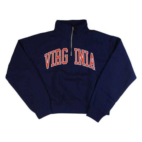 Show your school spirit with this University of Virginia women's navy 1/4 zip crop sweatshirt, featuring a stylish arched applique "Virginia" wordmark on the front. Perfect for layering, this comfortable and trendy piece is ideal for game days or casual wear.