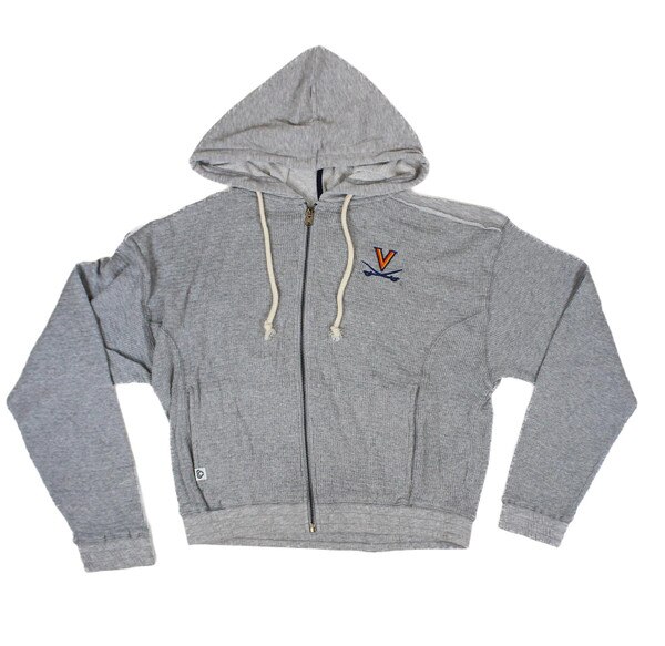 This University of Virginia ladies' full zipper hoodie offers a comfortable fit with front pockets, adjustable drawcords, and ribbed cuffs. The embroidered sabre logo adds a touch of UVA pride, making it a perfect piece for both casual wear and game day.