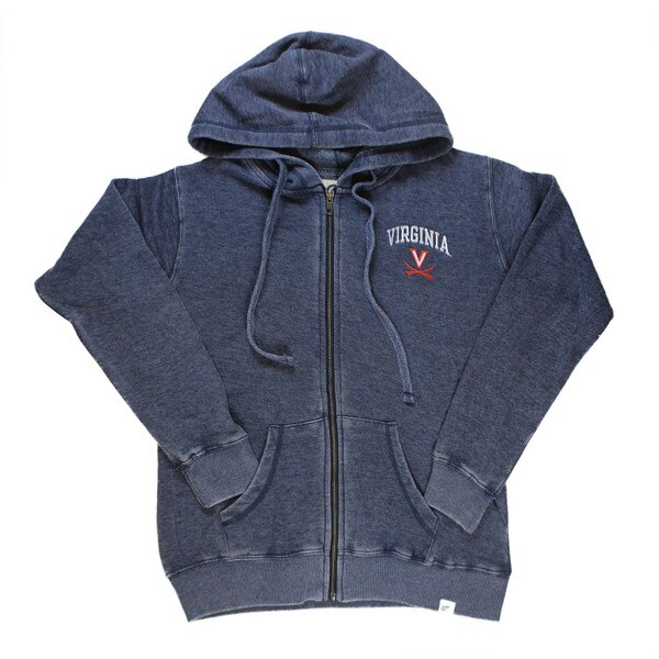 Stay cozy and stylish with this University of Virginia women's navy weathered full-zip hooded sweatshirt, featuring a soft, relaxed fit and embroidered UVA logo. Designed with front pockets and adjustable drawcords, it's perfect for game days or casual outings.