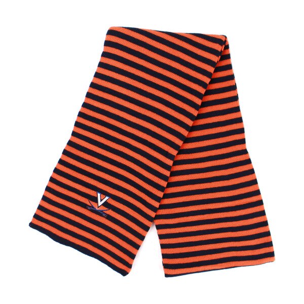 Knit scarf with orange and navy repeating stripe pattern. Features embroidered sabre logo on one end.