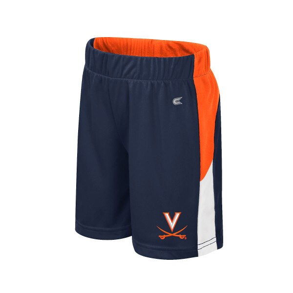 Toddler Upside Down shorts in navy with orange/white stripe. Features elastic waistband and rubberized sabre logo on left leg.